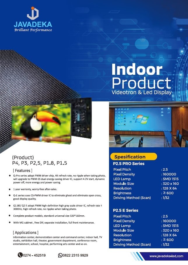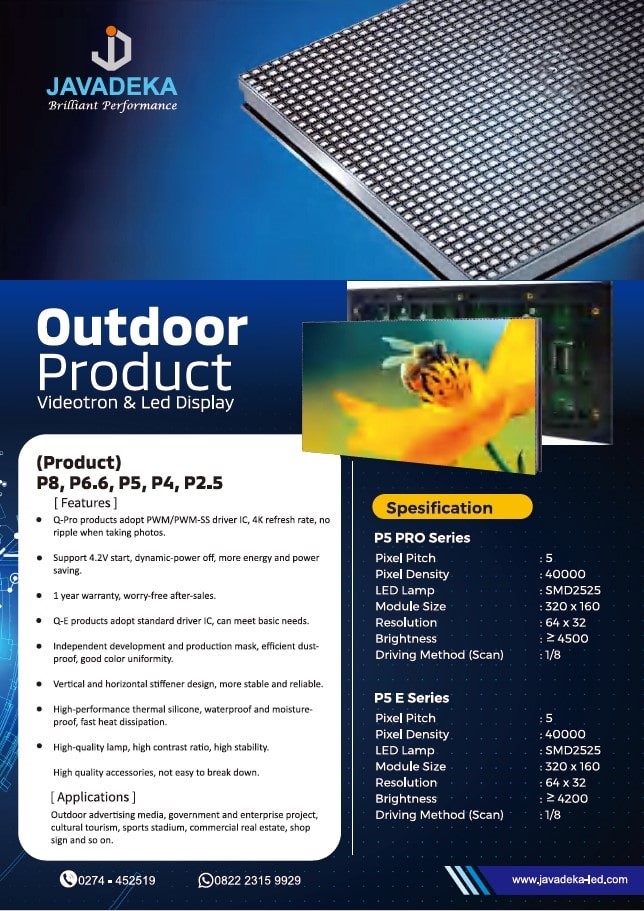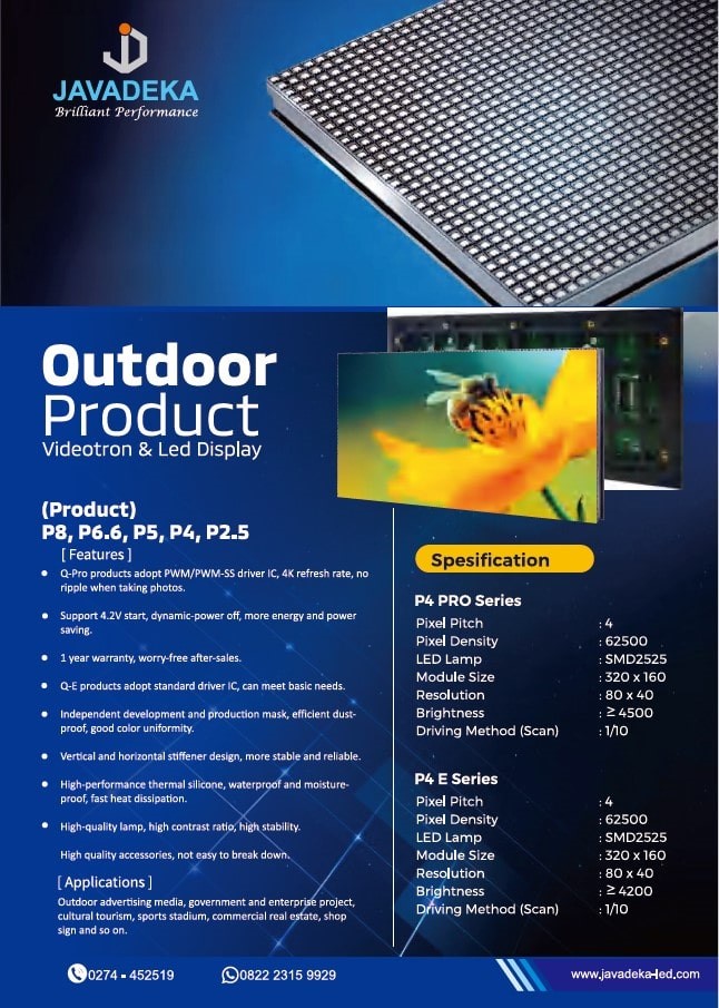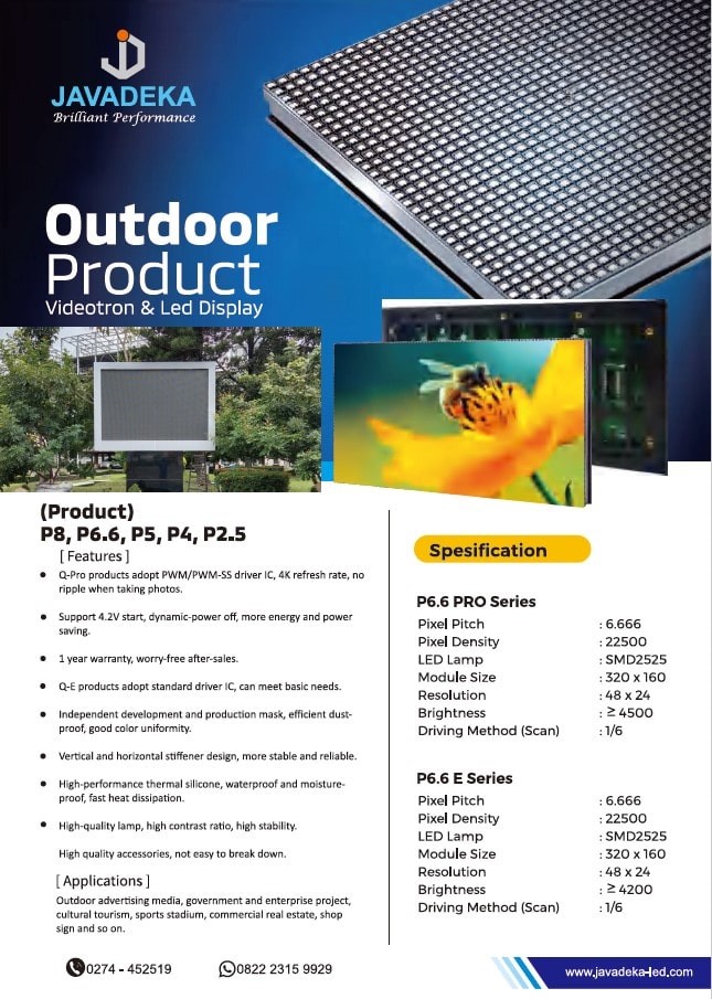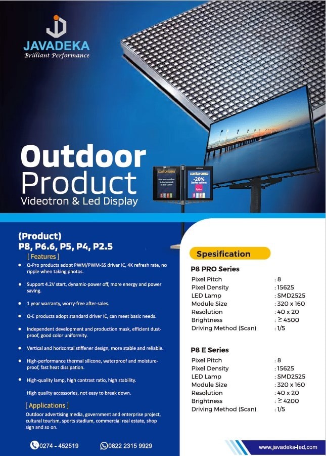 Layar videotron juga dibekali oleh LED (Light Emitting Diode). Teknologi ini memberikan tingkat kecerahan yang sangat tinggi dengan konsumsi daya yang rendah, sehingga mampu mencuri perhatian publik. Selain itu, ketahanan LED juga cukup lama. Cahaya yang keluar dari LED videotron tidak mudah redup.